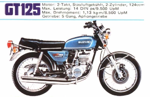 Mehr als die einzylindrige GP 125 kann sich in der Zeit davor ein Twin mit gleichem Hubraum, nämlich die GT 125, bei den Motorradfahrern beliebt machen. Sicher liegt das nicht nur an den 4,5 Mehr-PS der GT (GP:10PS,GT:14PS), sondern auch am Gesamteindruck. Die GT 125 sieht eher nach Motorrad aus. Die Ähnlichkeit mit dem stärkeren Schwestermodell GT 185 ist nahezu perfekt. Auch konstruktiv sind die beiden Suzuki bis auf den Elektrostarter an der GT 185 und den unterschiedlichen Hubraum identisch. Trotz der zufriedenstellenden Marktchancen zeigt sich die GT 125 nicht frei von Mängeln. Nachdem der kleine Zweizylinder 1974 und 1975 nahezu unverändert verkauft wurde, werden Motor-Modifikationen am 1976er Modell nahezu unumgänglich. Bis dahin brechen ziemlich häufig die Hubzapfen von der Kurbelwelle ab. Der Grund liegt in einem Konstruktionsfehler: An der Verbindungsstelle von Hubwange und Hubzapfen befindet sich eine Nut; hier entstehen Dauerbrüche durch Kerbwirkung. Die Beseitigung dieser Störquelle erfordert kostspielige Garantie-Abwicklung. Ab Motor-Nr. 73029 tritt Ende 1976 eine Getriebeänderung ein. In das fünfte Gangrad wird, um dessen Lebensdauer zu erhöhen, eine Messing-Gleitbuchse eingebaut; dadurch ändert sich die Dimensionierung der Schaltgabel und des Mitnehmers am Zahnrad für den dritten Gang. 1977 fällt die Ram Air-Lufthutze über den Zylinderköpfen weg. Der Mittelständer erhält Versteifungen; zu häufig ist er in den Jahren davor gebrochen. Mit Schwierigkeiten an der elektrischen Anlage müssen sich auch die GT125-Besitzer herumärgern. Ebenso wie bei den TS- und RV-Modellen besteht zwar auch hier die Möglichkeit, diverse Kabel umzuklemmen, um die Ladeleistung zu erhöhen, doch muß auch mit den gleichen Folgen gerechnet werden: kochende Batterien, dadurch Wasserverlust. Wer nicht rechtzeitig nachfüllt, riskiert wieder defekte Gleichrichter und Lampen. Der störanfällig unter der Bank verlegte Kabelbaum trägt das Seine zur unzulänglichen Bordelektrik bei. Dazu kommt, daß bei der GT 125 ebenso wie bei den beiden TS die Phase zwischen Fern- und Abblendlicht zu lang ist und der Fahrer eine Zeit im Dunkeln fährt. Bei Regenfahrten setzt sich das Luftfilter mit Wasser zu, der Motor läuft zu fett, und die Zündkerzen können verrußen. Stationen der Modellpflege 1974 Debüt. 14 PS. 1976 Ab Motor-Nr. 73029 Getriebeänderung: 5. Gangrad mit Messingbuchse, dadurch Änderung des Antriebszahnrades für den 3. Gang und der Schaltgabel. Fertigungsqualität der Kurbelwelle verbessert. 1977 Motor ohne Ram Air-Hutze, Mittelständer verstärkt. Letztes Baujahr. Die häufigsten Mängel Störanfällig verlegter Kabelbaum unter der Bank. Phase zwischen Fern- und Abblendlicht zu lang. Schlechte Lichtmaschinen-Ladeleistung. Leistung kann durch Umklemmen diverser Kabel verbessert werden, dadurch aber Risiko durch kochende Batterie, defekte Gleichrichter und Lampen. Defekte Lampen auch im Normalzustand. Luftfilter setzt sich bei Regen mit Wasser zu. Bis 1976: Hubzapfen können abbrechen. Kurbelwellenschäden, außerdem schlecht gewuchtet. Bis 1977: Mittelständerbrechen. Suzuki GT 125, 2 Zylinder, schlitzgesteuert, 124 ccm, Bj. 1976 mit 14 PS (10 kW), 120 km/h.